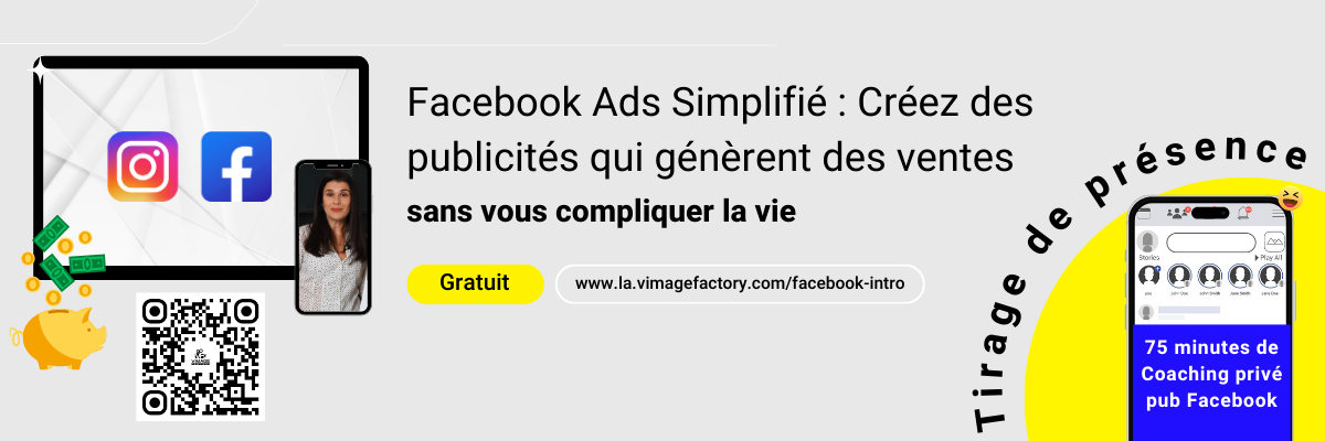 Tirage de présence : Un coaching virtuel de 75 minutes pour apprendre à créer vos publicités Facebook qui génère des ventes. Offre d’une valeur de 400 $.
